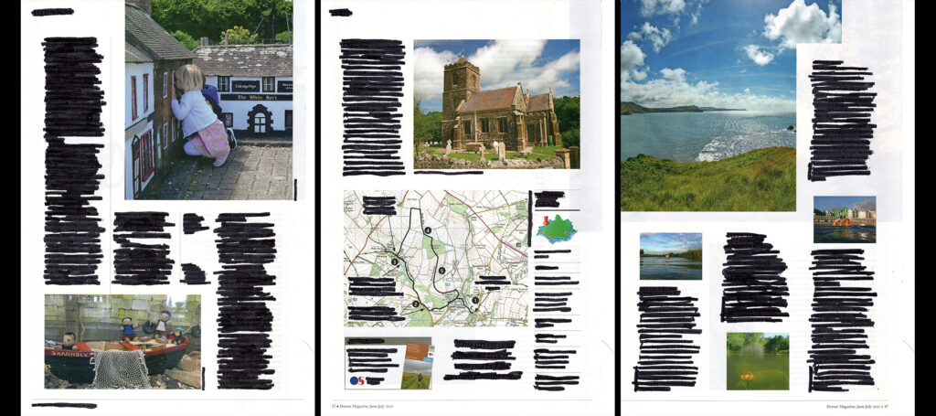 Redacting the magazine is the easy part. In selecting I first chose the page with the children and the bears. Without the context have we now discovered giant children somewhere and have teddy bears finally arrived on our shores? Another part of the children’s image raises the question what are they looking at?